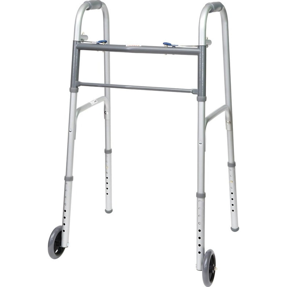 ProBasics Economy Two-Button Folding Steel Walker provides maximum strength in a durable design, all backed by a limited lifetime warranty.Β Ample height adjustment options coupled with a two-button folding mechanism make it easy to use and accommodating to the most demanding patient needs. Available with or without 5" wheels and in junior or adult sizes. Supports patient weights up to 350 pounds.