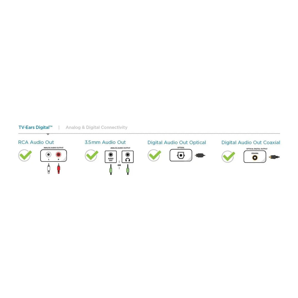 The TV•Ears® Digital transmitter is placed on a flat surface facing the seating area. It simply connects to your TV, cable box, or satellite box equipped with any Optical, Coaxial, 3.5 to 3.5 or RCA audio out ports. The transmitter then sends audio wirelessly to the headset worn by the user. Volume and tone adjustments are available on the headset for creating perfect dialog clarity.