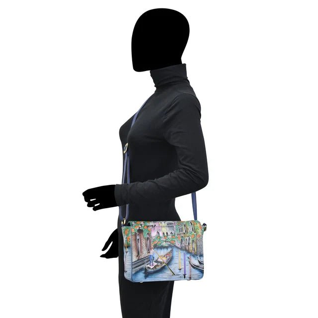 Inspired by the romantic charm of Venice, the Anuschka Venetian Sunset Flap Crossbody captures the serene beauty of gondolas gliding along flower-lined canals. Hand-painted on genuine leather, each bag is a unique masterpiece designed for effortless organization and timeless style.