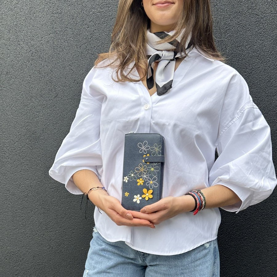 The Espe Daisy Clutch Wallet blends cheerful design with everyday practicality. Crafted from soft, pebbled vegan leather, this cruelty-free wallet features a bright daisy motif that adds personality while keeping your essentials neatly organized and protected.