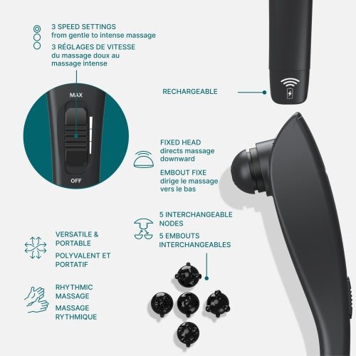 The massager is cordless and rechargeable, making it easy to use at home or take with you while traveling. Its ergonomic, lightweight design lets you reach different areas comfortably during self-treatment.