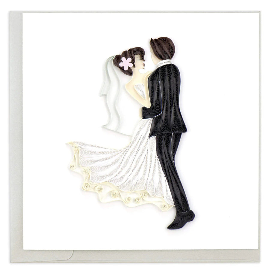 Celebrate love and marriage with the Quilled Dancing Bride and Groom Card, featuring a beautifully handcrafted depiction of a bride and groom embracing and dancing. The bride wears a flowing white dress, and the groom is in a dark suit, capturing the elegance and joy of the wedding day. This quilled design creates a timeless keepsake for newlyweds or couples celebrating an anniversary.