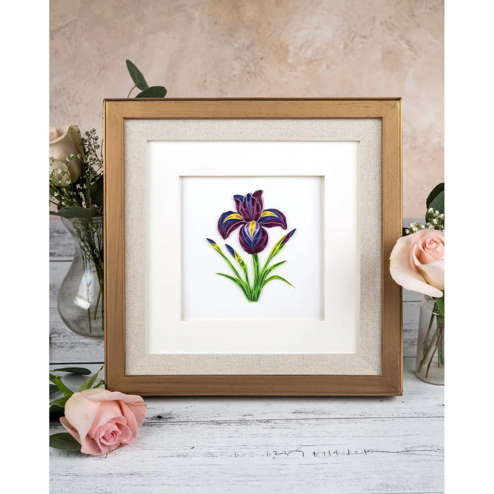 Handmade quilled iris greeting cards offer elegance and meaning for any occasion. Irises represent wisdom and royalty, making this design a thoughtful gift for flower lovers. Each card is carefully crafted by a skilled artisan in about one hour, featuring vibrant purple quilled irises with green stems and leaves.