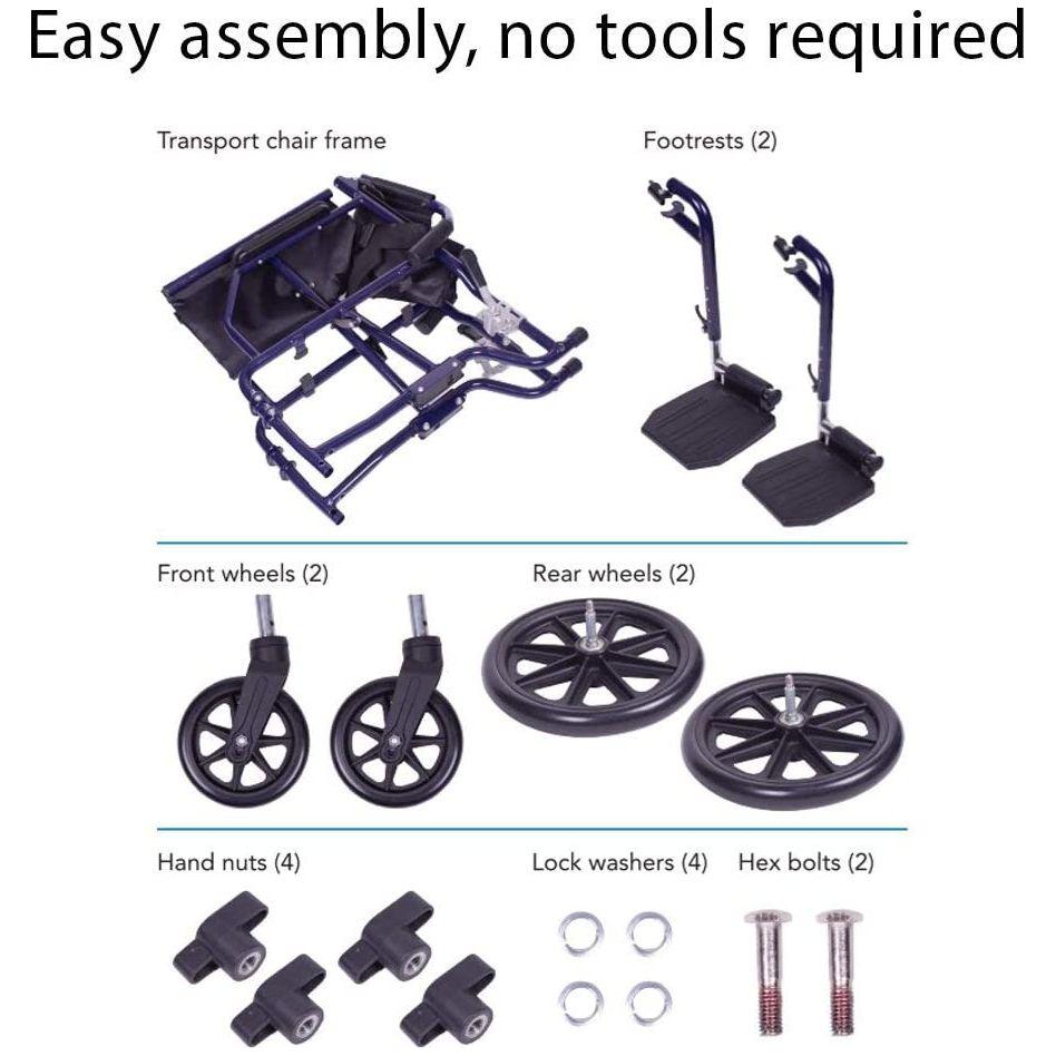Stay mobile on all terrains with the Carex Classics Transport Chair. This transport chair features oversized 8" wheels for easy maneuverability and a smooth glide. The swing-away footrests and folding features allow for compact storage and transportation—an excellent choice for safe, sturdy, and comfortable portability. No assembly required.
