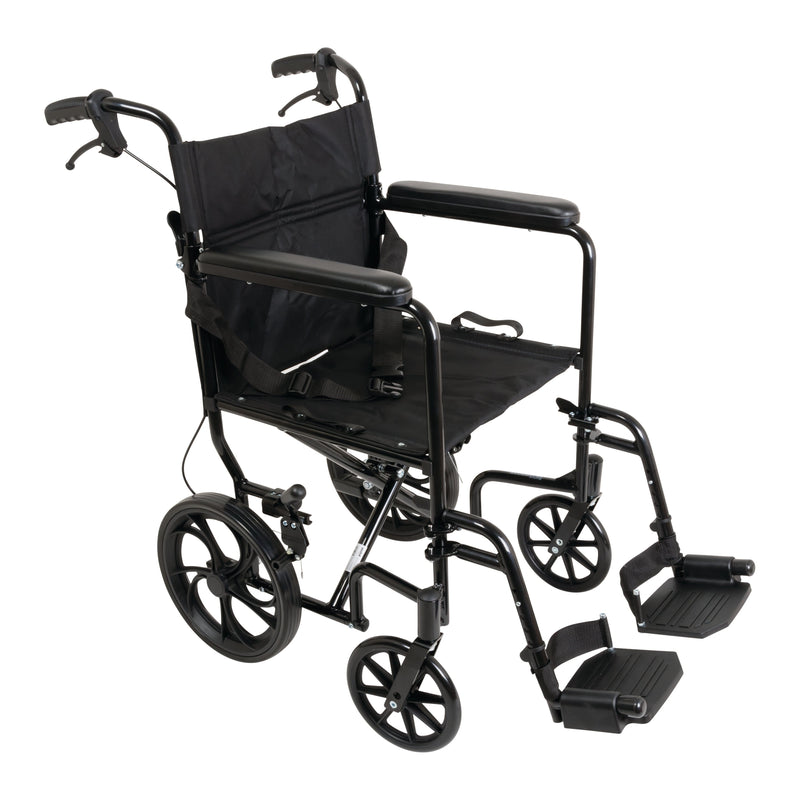 The ProBasics Lightweight Aluminum Transport Chair with 12" rear wheelsΒ has a lightweight aluminum frame and padded upholstery. The flared handles and handy back-release hinge allow the back to fold down for easy storage and transport. The companion activated hand brakes are ideal for locking the rear wheels during patient transfers, and provide for added safety and control. Comes complete with seat belt, swingaway footrests with composite footplates and heel loops. Supports patient weights up to 300 lb.